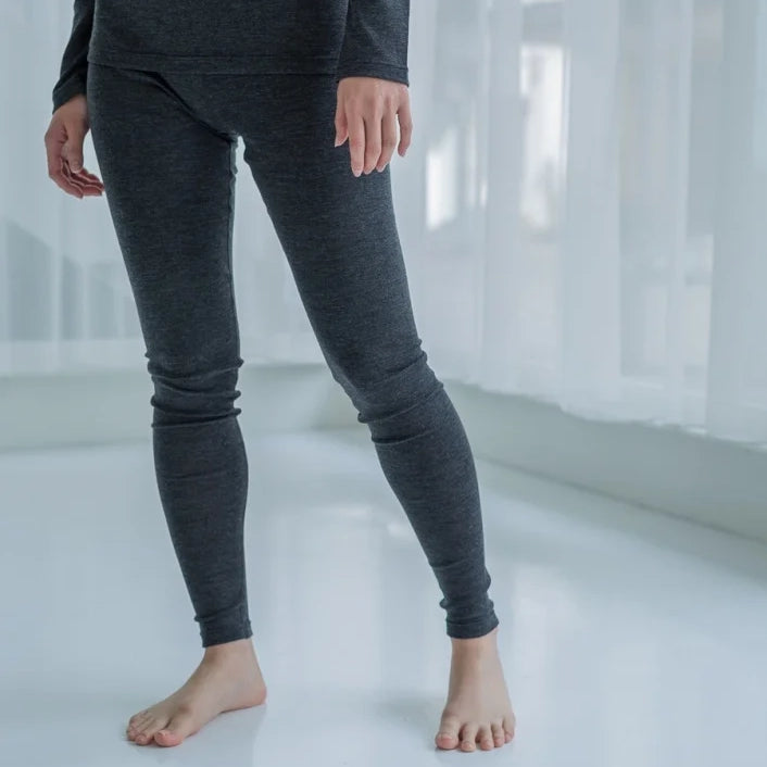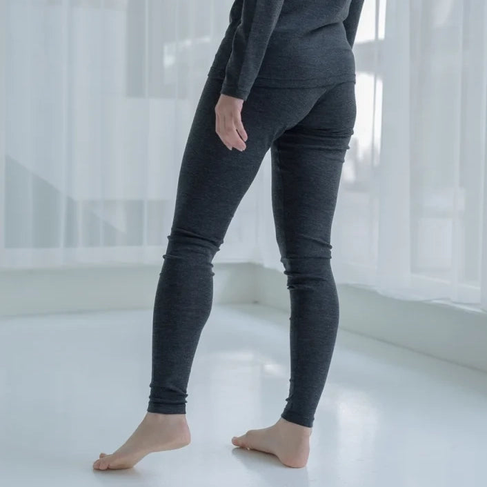 秋・冬の冷えから守る柔らかレギンス。極細17.5ミクロンのスーパーエクストラファインメリノ100%使用。 落ち着いたダークカラーの霜降り生地がラグジュアリーさを演出します。足元、ウエストに切り替えがなくミニマムな美しさを追求しています。リブ編みの伸縮性を利用して体形にフィット、優しいストレッチで履きやすいデザインです。 柔らかで起毛感のあるハイゲージニットは優しい肌触りで、下腹部を冷えから守ります。極細のメリノ繊維ですので、チクチクしたり静電気が起きません。とても軽く冬の重ね着アイテムとしても優れています 化学繊維が苦手な方にも、コットンでおこる汗のベタつきや、汗冷えにお悩みの方にも、メリノウールは汗を瞬時に吸収・発散しますので快適な環境を常に保ちます。