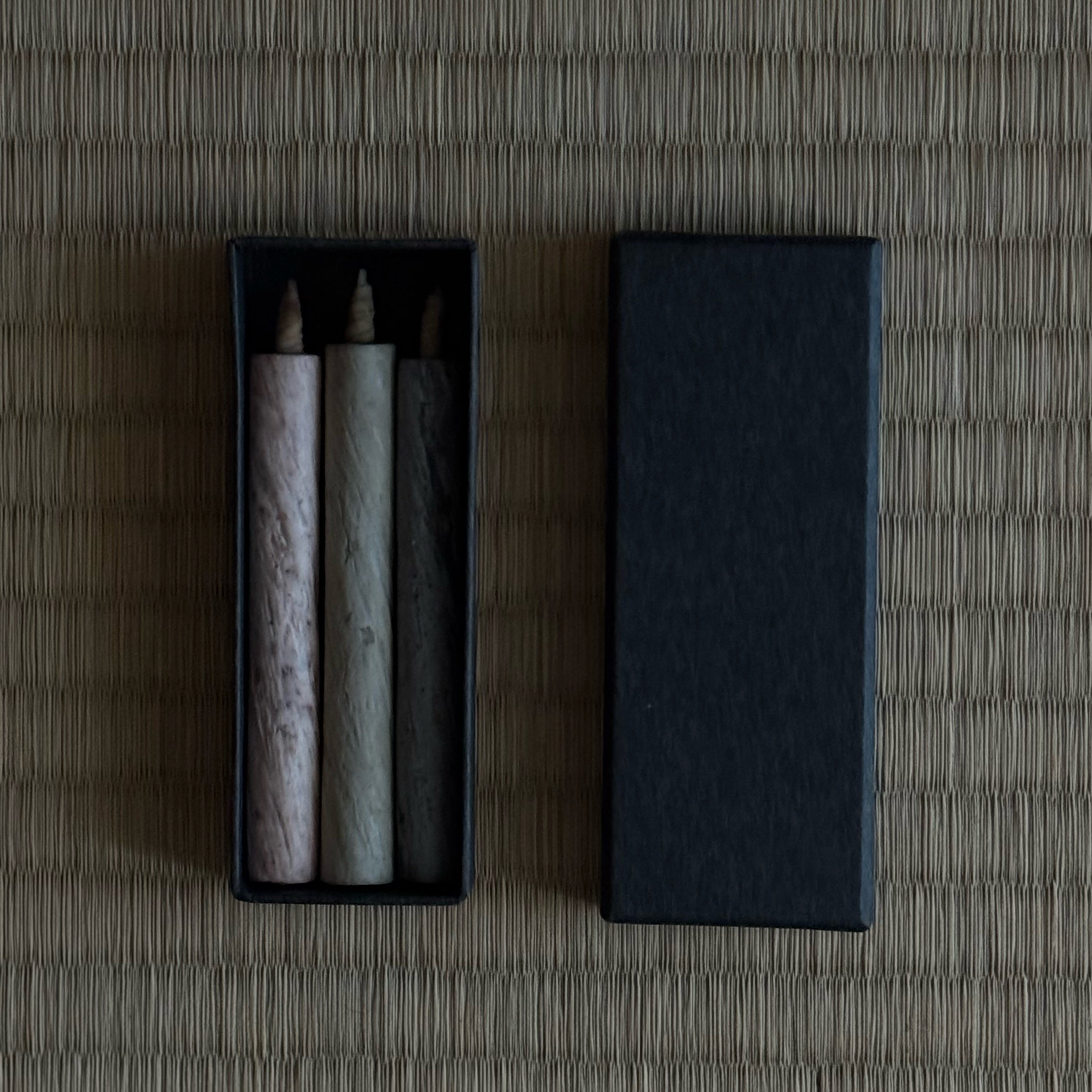3本セットになっておりますが、箱と3本の蝋燭は作家の制作の都合上変わります。ご希望がありましたら作家にオーダーしますので、お時間をいただきますが、メールにてご連絡ください。shop@drivedirection.jp