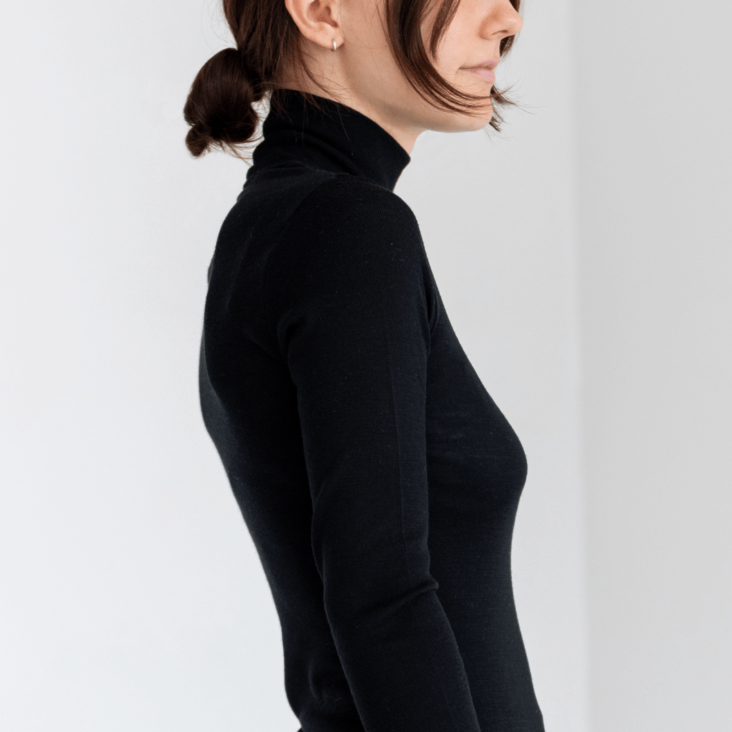 秋口から春先まで温かいインナーとして重宝するタートルネック。エクストラファインメリノ100%使用。