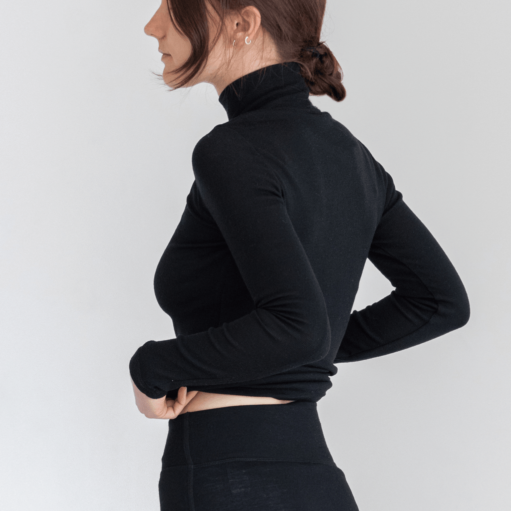 程よい長さのネックの立ち上がりで、動作の妨げないデザイン。重ね着してもかさばらず、ニットやカーディガンのインナーに重宝。手首を覆う少し長めスリーブは、上に重ねた洋服の袖から覗かせたレイヤードをアクセントに楽しめます。