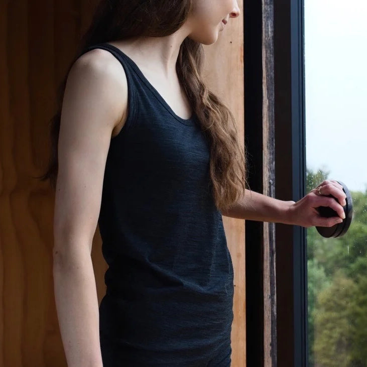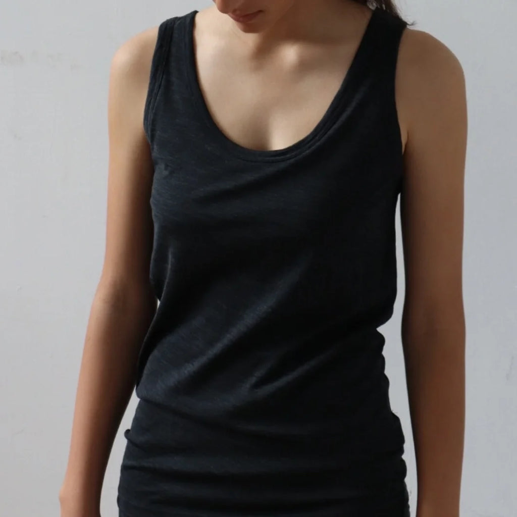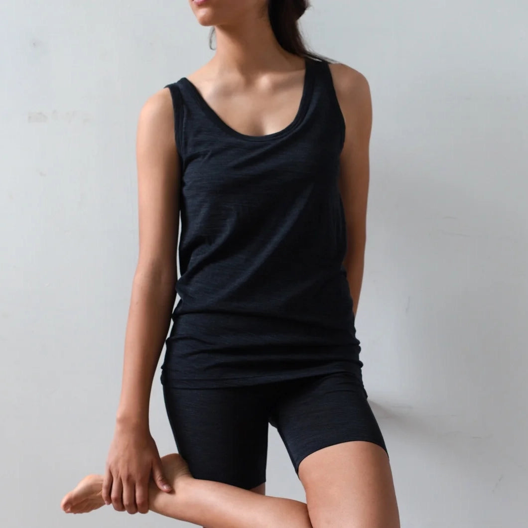 肌と一体に感じる、透け感ある薄手のブラタンクトップ。超軽量・極細のスーパーエクストラファインメリノ100%使用